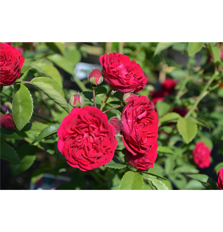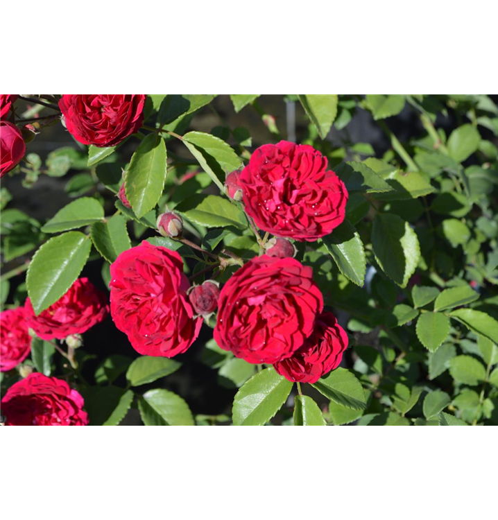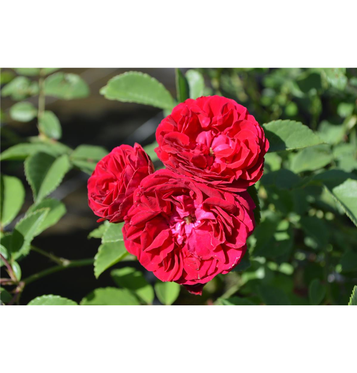 Die dunkelroten, schalenförmigen Blüten sind gefüllt und erscheinen von Juni bis Juli. Diese sind leicht duftend.