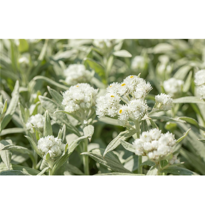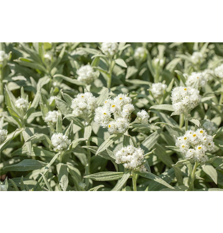 Das Große Garten-Perlkörbchen 'Neuschnee' (Anaphalis margaritacea) ist eine buschige, ausläuferbildende Staude, die von Juli bis August weiße, ballförmige, in Dolden angeordnete Blüten bildet. An einem sonnigen Standort mit durchlässigem, nährstoffreichem Boden erreicht es gewöhnlich eine Höhe von ca. 50 cm und wird ca. 40 cm breit. Das Große Garten-Perlkörbchen 'Neuschnee' ist gut frostverträglich.
