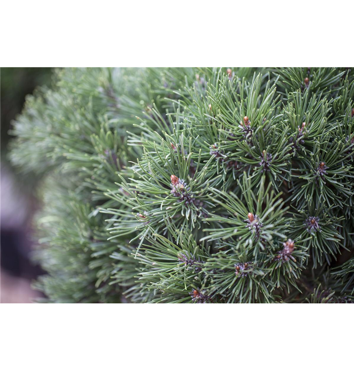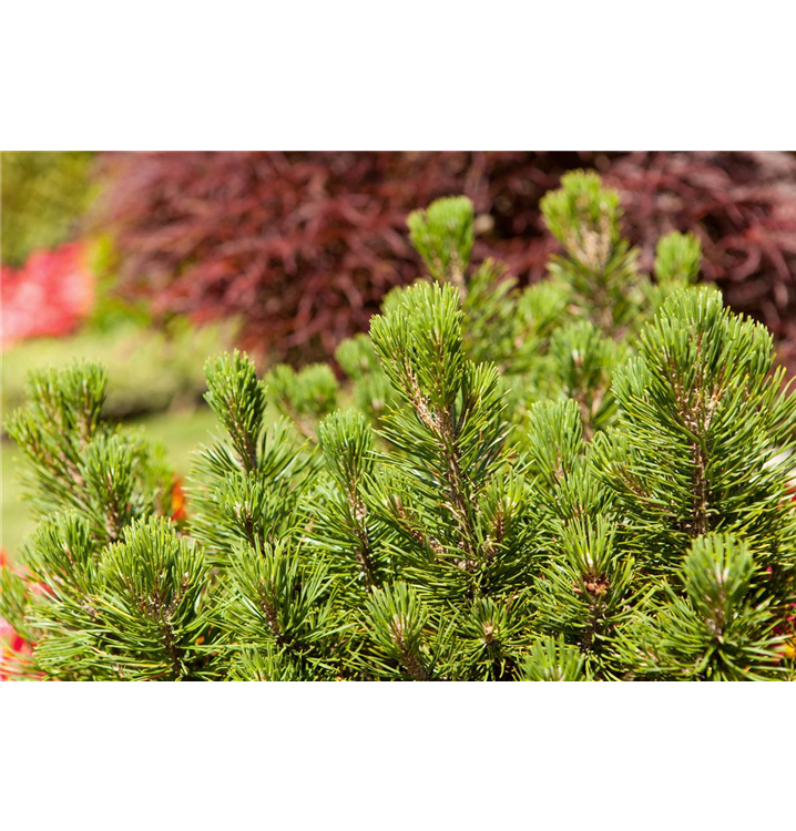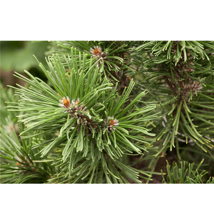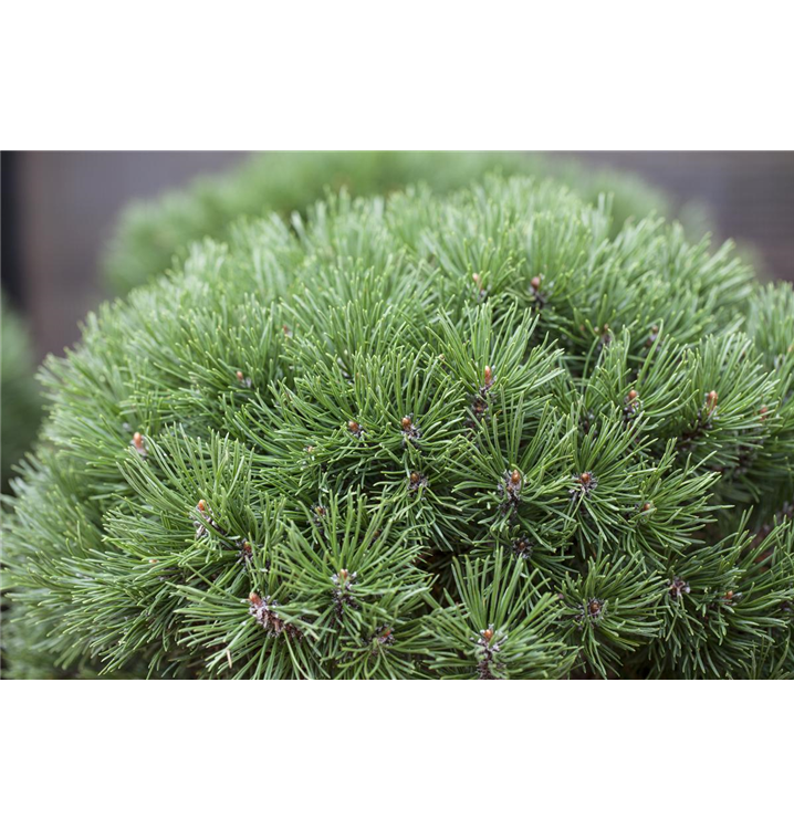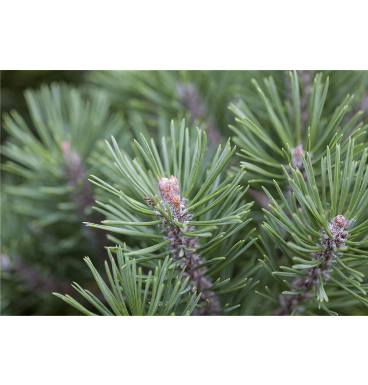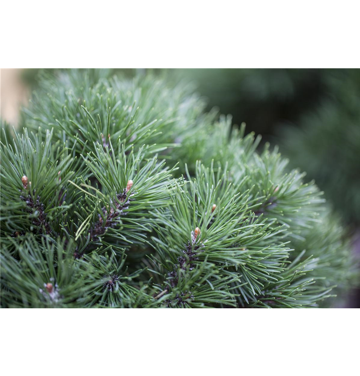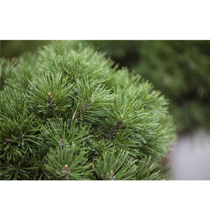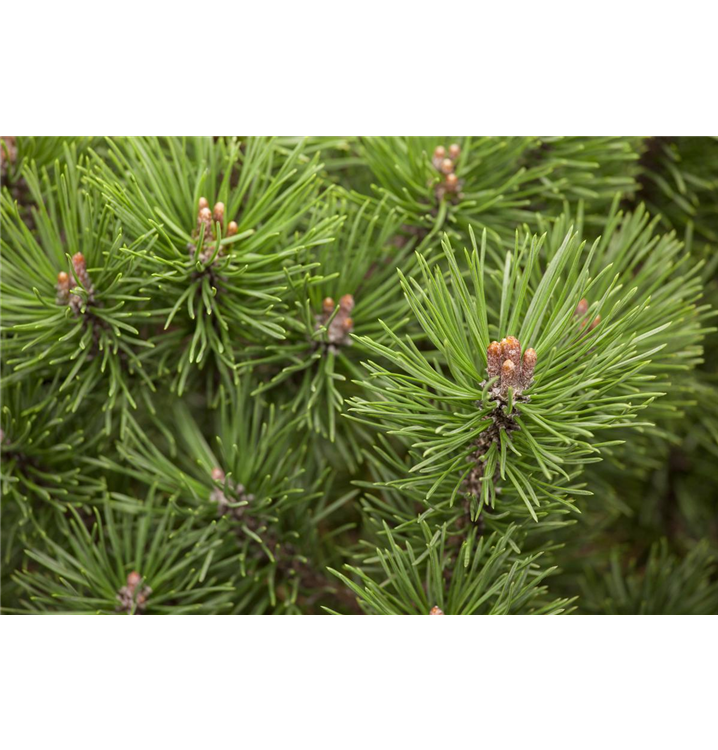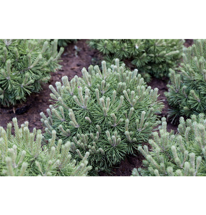 Die Kugel-Kiefer 'Mops' (Pinus mugo) ist ein Kleinstrauch, welcher dicht, kugelförmig wächst und gewöhnlich eine Höhe von ca. 2 m und eine Breite von ca. 1 m erreicht. Ihre nadelförmigen Blätter haben eine mittelgrüne Färbung. Dekorative braun-gelbe Zapfen zieren Pinus mugo 'Mops' ab Oktober. Dieses Gehölz ist gut frostverträglich. Sie bevorzugt einen sonnigen bis halbschattigen Standort. An den Boden stellt die Kugel-Kiefer 'Mops' keine besonderen Ansprüche.