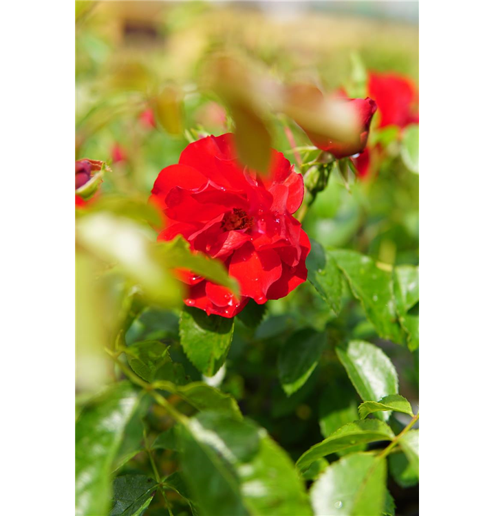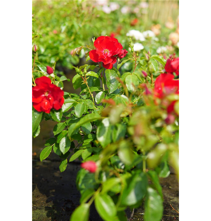 Die Bodendeckerrose 'Centro Rose'® (Rosa) präsentiert sich als reichblühende Rose, die im Garten eine besondere Funktion erfüllt. Die zahlreichen gefüllten, roten Blüten erscheinen von Juni bis Oktober. In Gesellschaft geeigneter Begleiter erstrahlt die Königin der Blumen besonders prächtig. Niedrige Stauden, Lavendel und Salbei bieten sich optimal als harmonische Partner an.