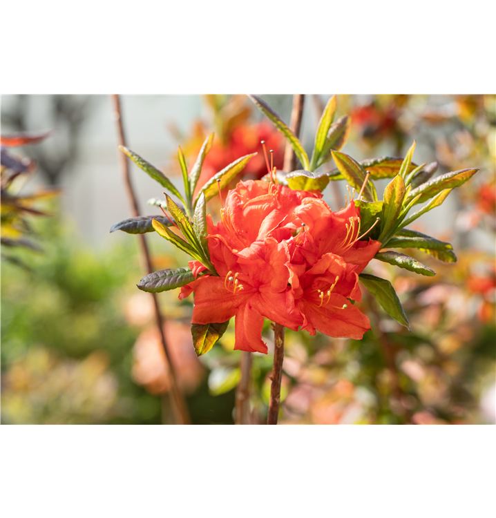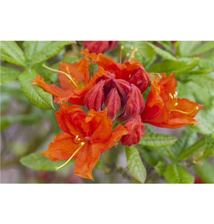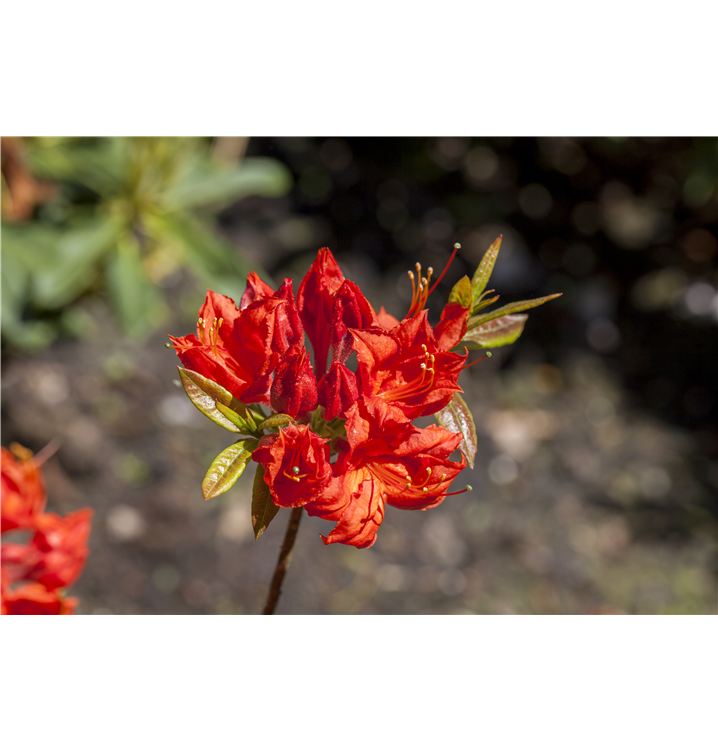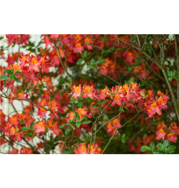 Die Sommergrüne Azalee 'Royal Command' (Rhododendron luteum) bringt von Mitte Mai bis Ende Juni ein wahres Meer aus orange-roten Blüten hervor. Ihr sommergrünes Laub ist mittelgrün. Im Herbst verwandeln sich das Laub in Dunkelrot. Dieses aufrecht wachsende Gehölz erreicht gewöhnlich eine Höhe von 2 - 3 m und eine Breite von 2 bis 3 m. Ein halbschattiger (bis schattiger) Standort und ein humoser, kalkfreier Boden schaffen optimale Bedingungen für ein gesundes Wachstum. Die Sommergrüne Azalee 'Royal Command' ist gut frostverträglich.