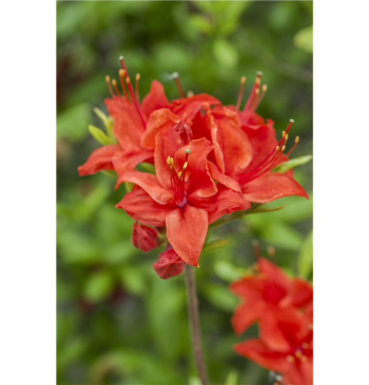 Die orange-roten Blüten der Sommergrünen Azalee 'Royal Command' erscheinen in Dolden von Mitte Mai bis Ende Juni. Diese sind stark duftend.
