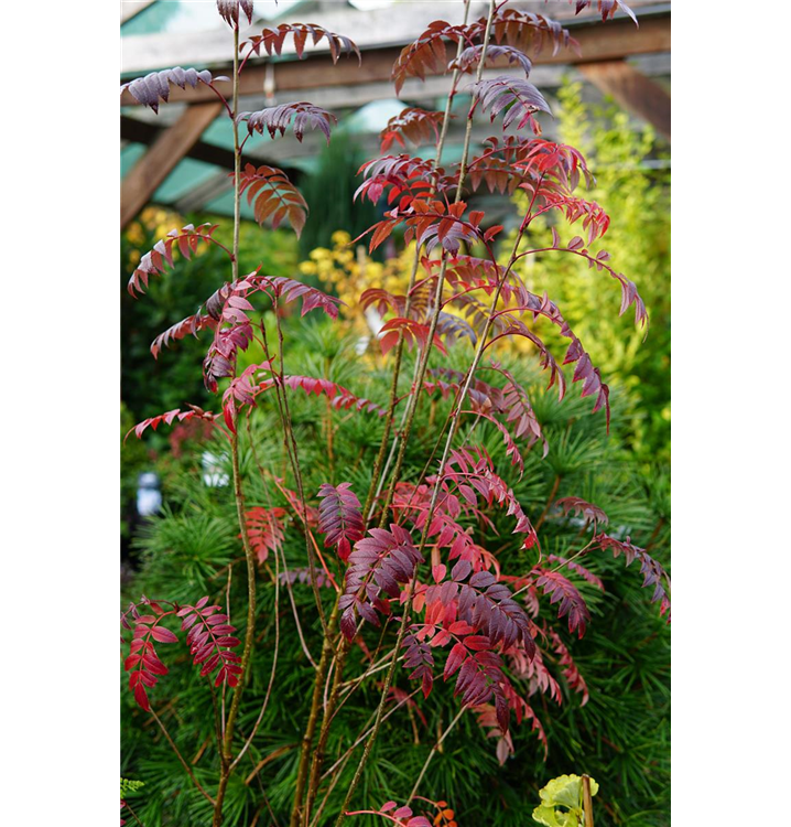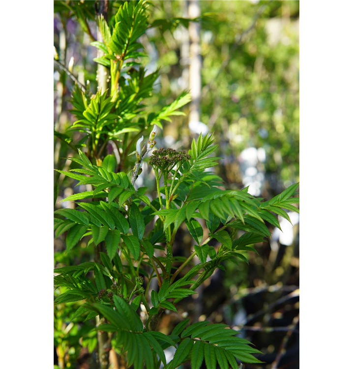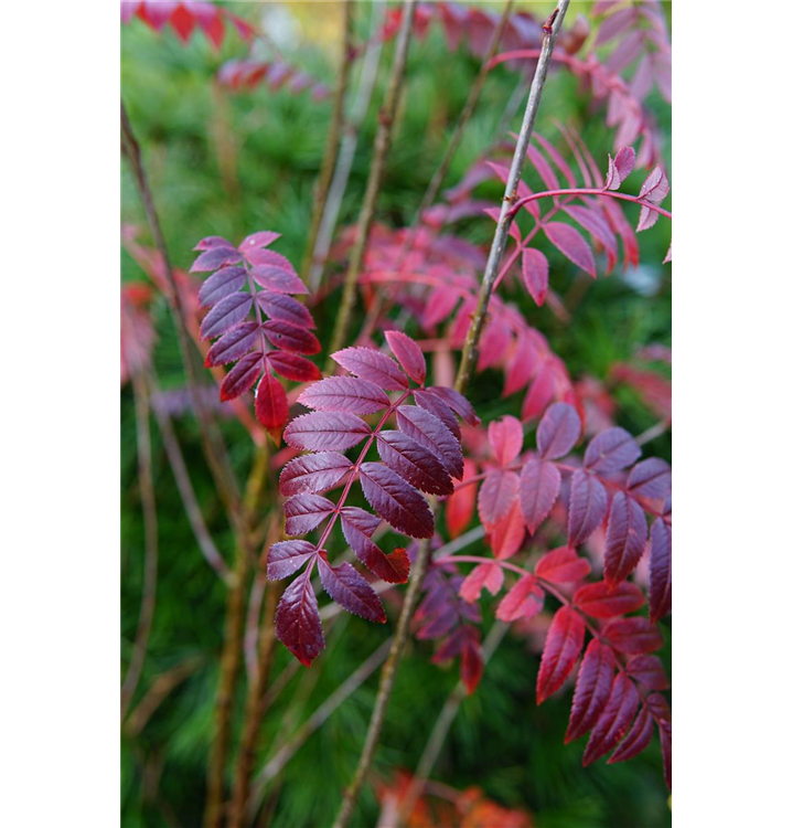Die sommergrünen Blätter der Eberesche 'Autumn Spire'® sind mittelgrün, gefiedert, wechselständig. Eberesche 'Autumn Spire'® zeigt sich leuchtend orange-rot im Herbst.