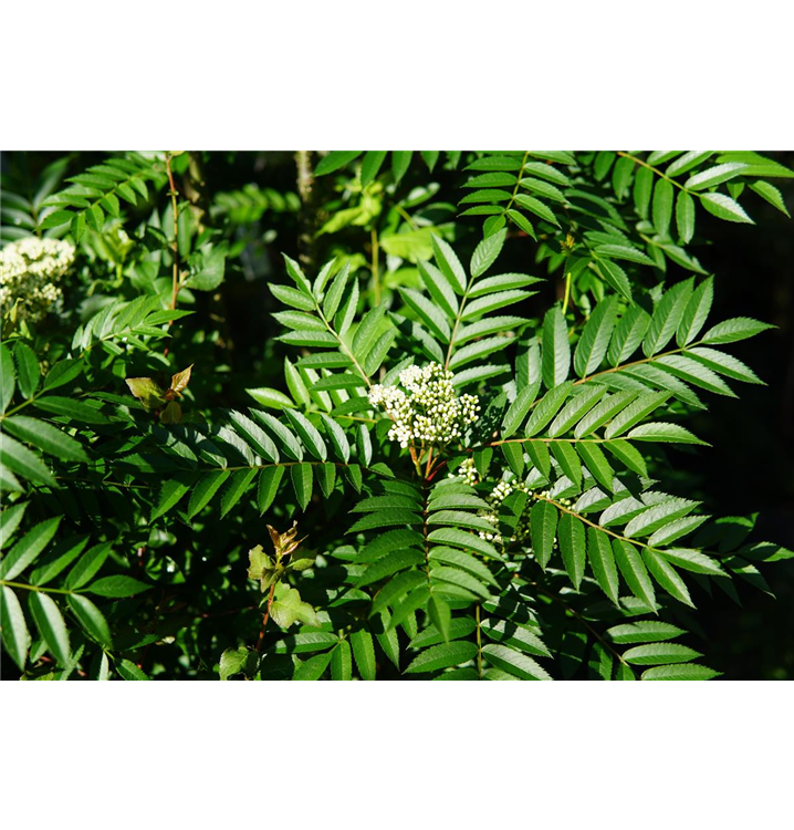 Die weißen Blüten der Eberesche 'Autumn Spire'® erscheinen in Rispen von Mai bis Juni.