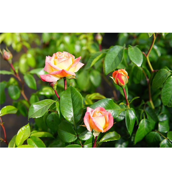 Die Edelrose 'Concorde'®(s) (Rosa) ist eine prachtvoll blühende Rose, die im Garten eine besondere Rolle einnimmt. Ihre zahlreichen, starkgefüllten Blüten sind mehrfarbig und erscheinen von Juni bis Oktober, was für eine langanhaltende Farbenpracht sorgt. An sonnigen, warmen Tagen entfaltet sich ihr wunderbarer Duft und verzaubert die Umgebung. Um die Königin der Blumen besonders zur Geltung zu bringen, sind die richtigen Begleitpflanzen entscheidend. Niedrige Stauden, Lavendel und Salbei eignen sich hervorragend, um die Schönheit der 'Concorde'® Rose zu unterstreichen und eine harmonische Gartenkomposition zu schaffen.