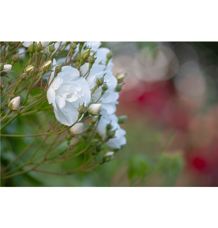 Die Kletterrose 'Bobby James' (Rosa) ist eine reichblühende Rose, die im Garten eine besondere Rolle spielt. Die zahlreichen Blüten sind weiß und erscheinen von Juni bis Juli. Ihr intensiver Duft entfaltet sich besonders an sonnigen, warmen Tagen. Mit dem kletternden Wuchs wird dieses Gehölz bis zu 5 m hoch und 3 m breit.