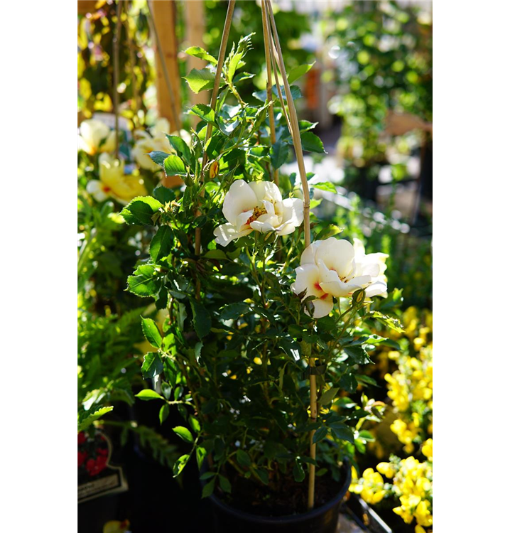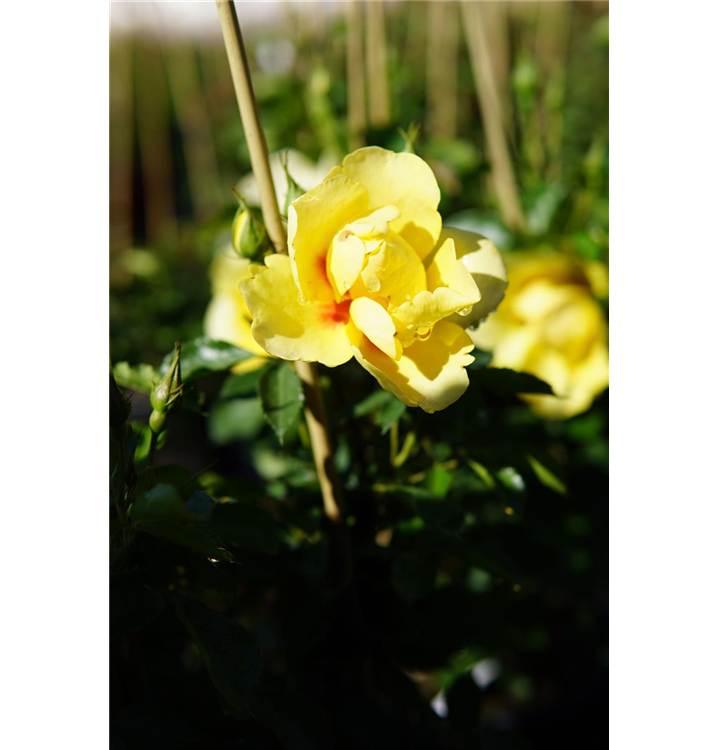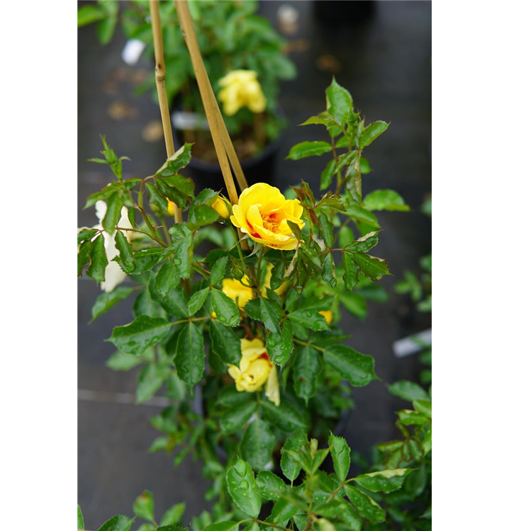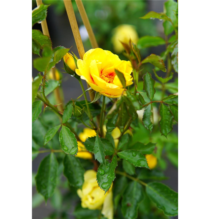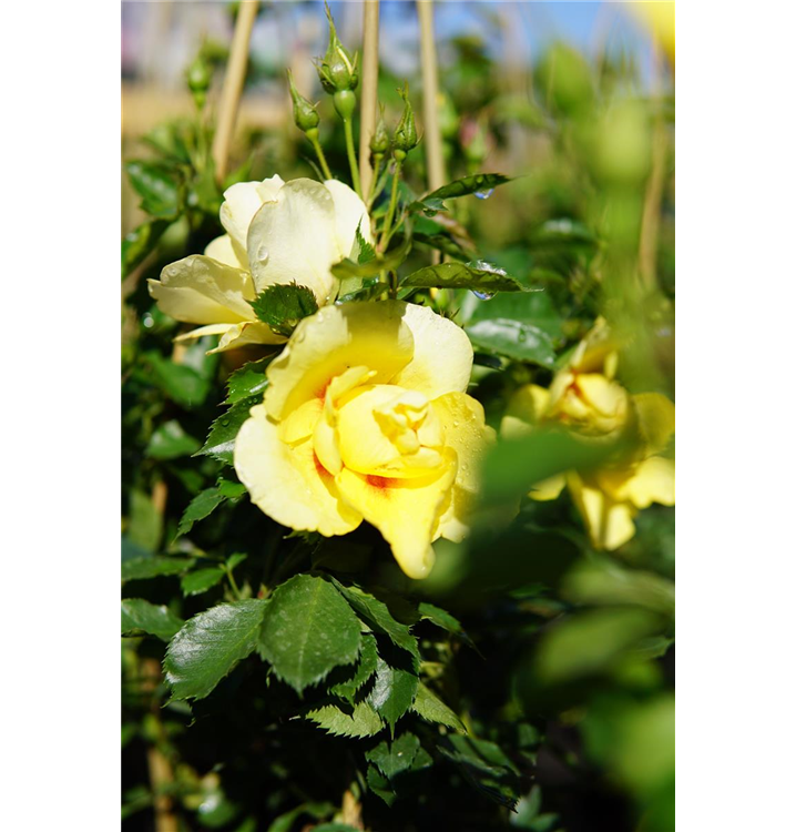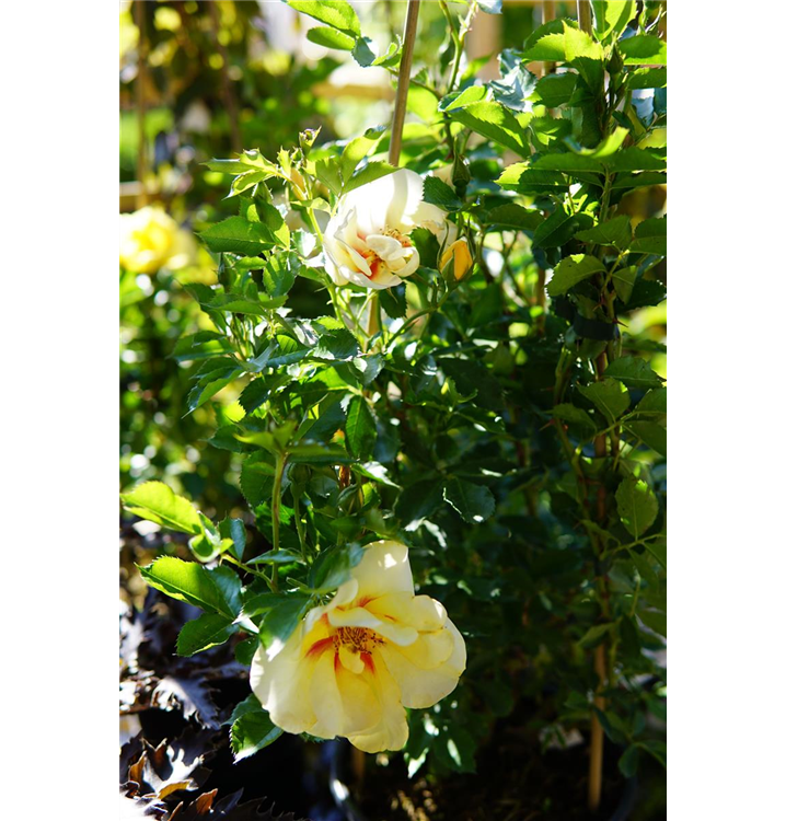 Die Strauchrose 'Eyeconic'® (Rosa) erblüht als reichblühende Pracht im Garten. Ihre gelb-roten Blüten zieren den Garten von Juni bis Oktober in großer Zahl. Um die Königin der Blumen gebührend zur Geltung zu bringen, sind passende Begleiter essentiell. Niedrige Stauden, Lavendel und Salbei setzen nicht nur farbliche Kontraste, sondern betonen auch die Schönheit dieser Rose und schaffen eine harmonische Gartenlandschaft.