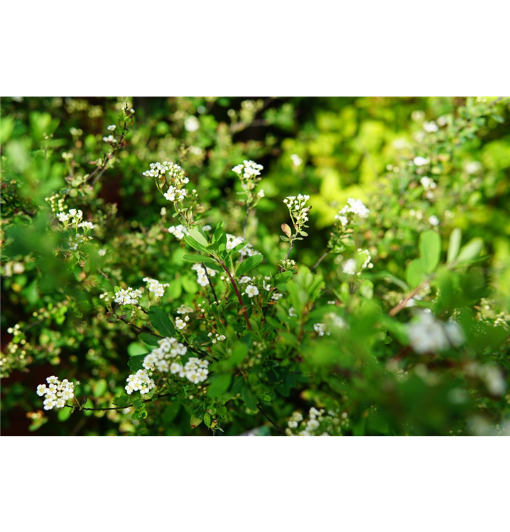 Die weißen Blüten der Strauchspiere 'Snowmound' erscheinen in Doldentrauben von Ende Mai bis Juni.