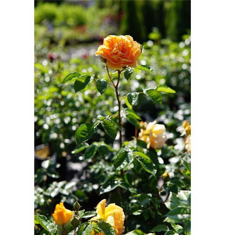 Die 'Goldelse'® (Rosa), eine wahre Blütenkönigin, erobert den Garten mit einer Fülle von dunkelorangefarbenen, üppig gefüllten Blüten, die von Juni bis September in voller Pracht erstrahlen. Ihr betörender Duft entfaltet sich vor allem an warmen, sonnigen Tagen. Um sie gebührend zu präsentieren, sind die richtigen Begleiter entscheidend. Niedrige Stauden, Lavendel und Salbei setzen sie perfekt in Szene und lassen sie als die strahlende Diva erscheinen, die sie ist.