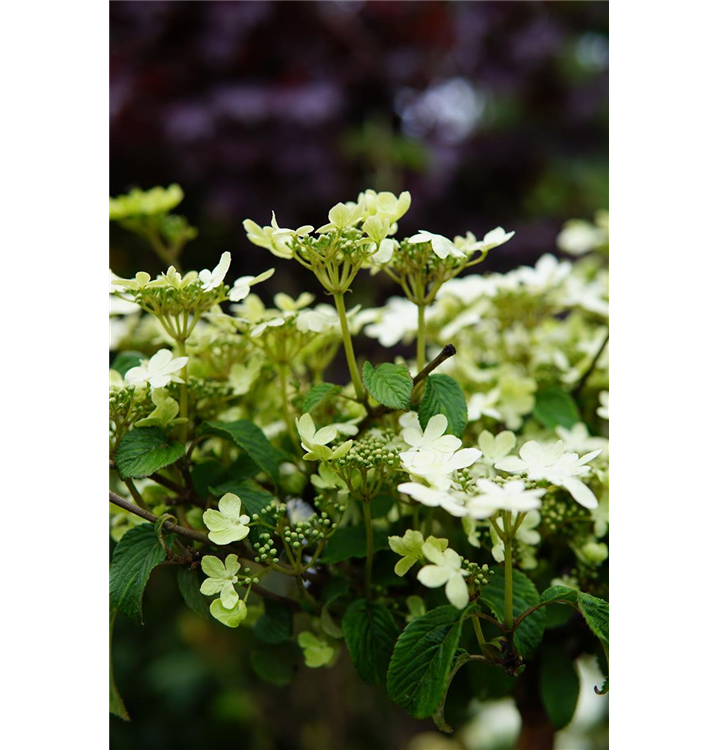 Der Gefüllte Schneeball 'Watanabe' (Viburnum plicatum) ist ein aufrechter, breiter, rundlicher Kleinstrauch, der weiße, in Trugdolden angeordnete Blüten mit einem starken Duft hervorbringt. Sie erscheinen von Juli bis August. Bei richtiger Pflege blüht der Gefüllte Schneeball 'Watanabe' erneut von Oktober bis November. An einem sonnigen bis halbschattigen Standort mit humosem, nährstoffreichem Boden erreicht er gewöhnlich eine Höhe von ca. 2 m und wird ca. 1,8 m breit.