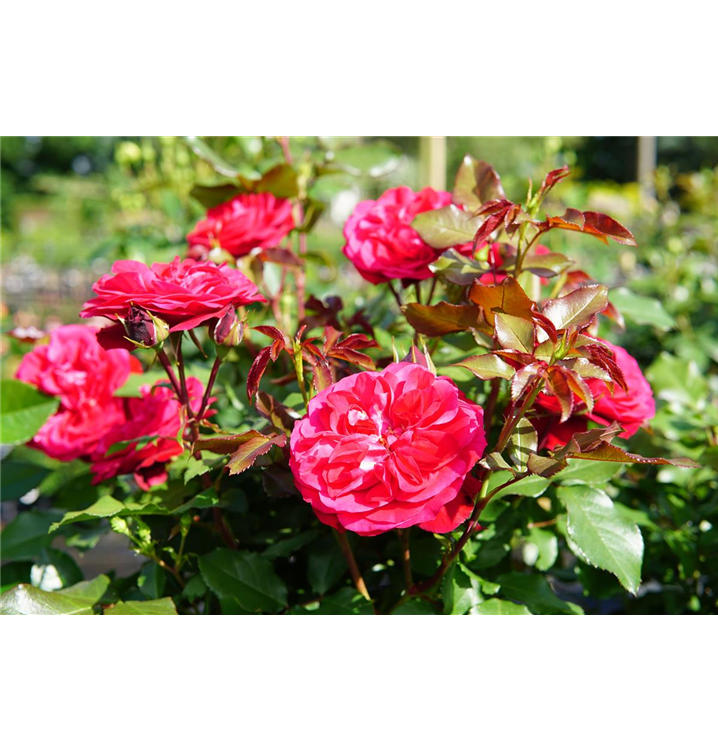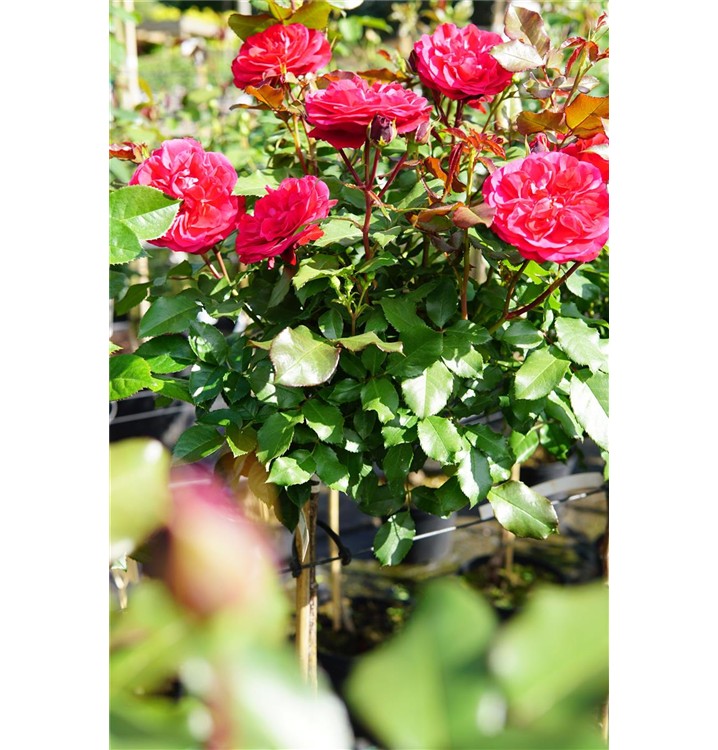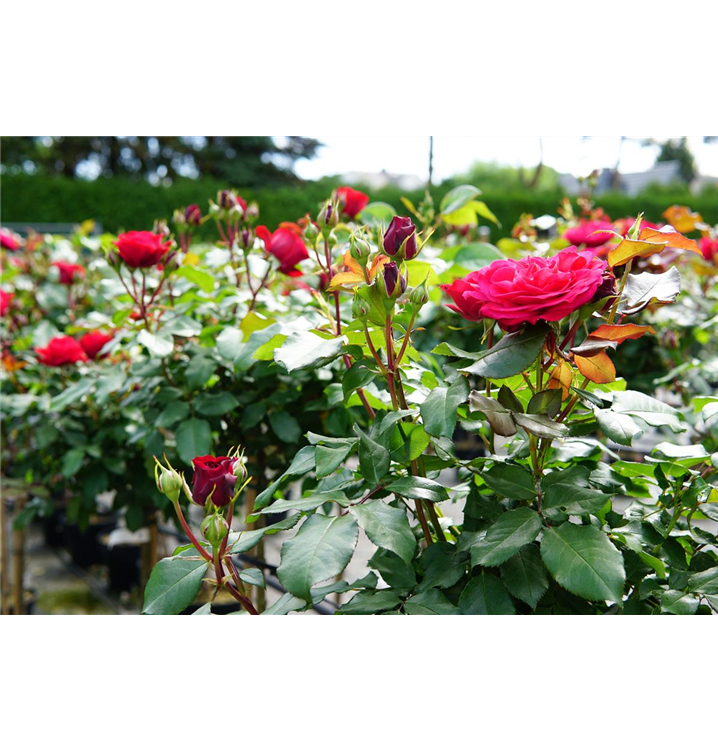 Die sommergrünen Blätter der Beetrose 'Hansestadt Rostock'® sind dunkelgrün, gefiedert, wechselständig.