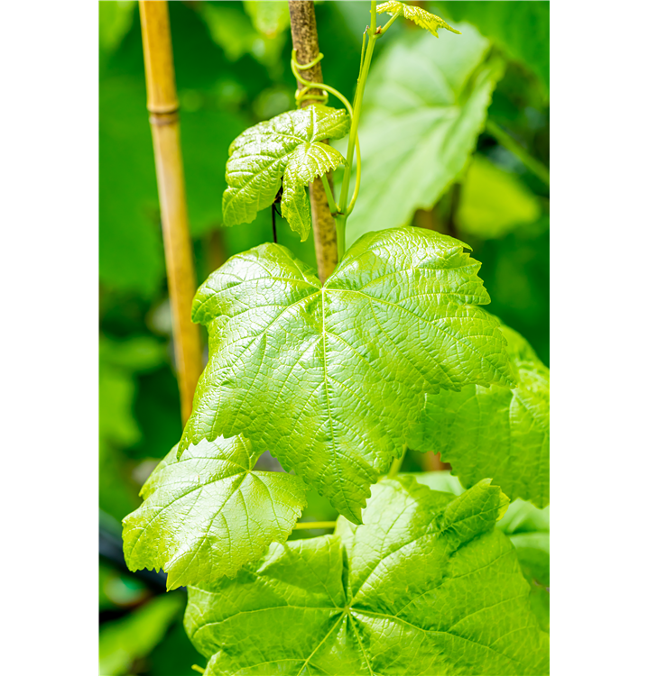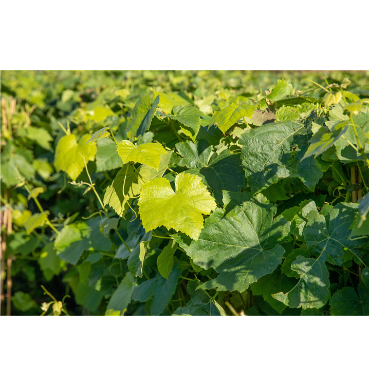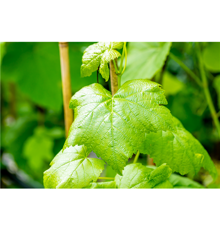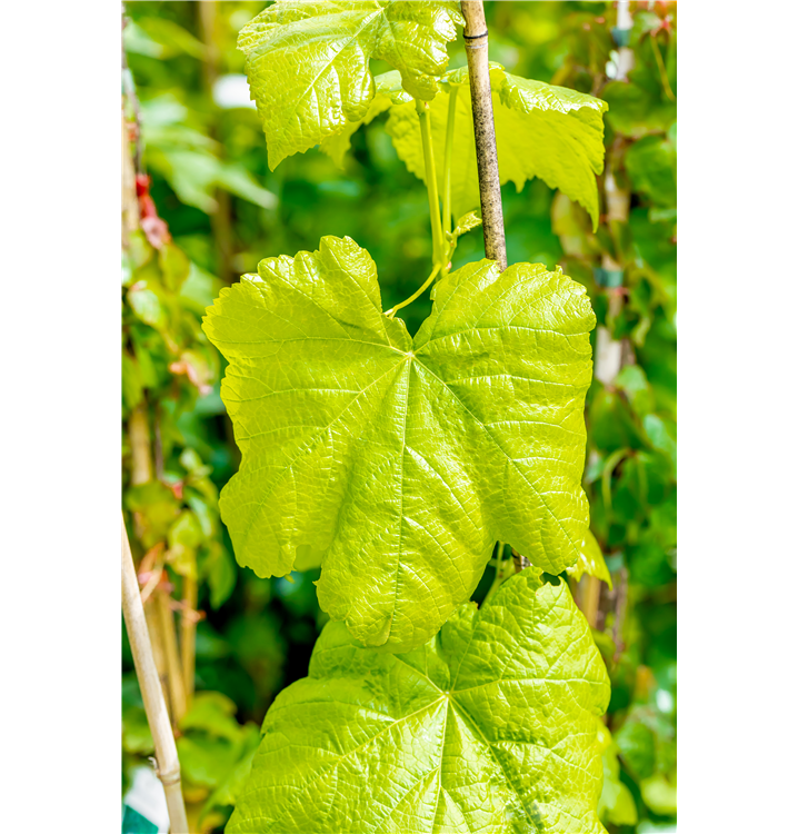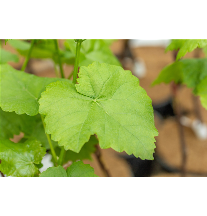 Die sommergrünen Blätter der Tafeltraube 'Romulus' sind dunkelgrün, herzförmig, gezähnt. Tafeltraube 'Romulus' zeigt sich leuchtend kupfergelb bis rot im Herbst.