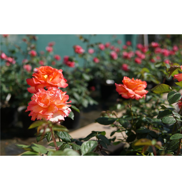 Die Edelrose 'Jazz Festival' (Rosa) ist eine reichblühende Rose, die im Garten aber auch auf Balkon oder Terrasse eine besondere Rolle spielt. Die zahlreichen gefüllten Blüten sind orangerot und erscheinen von Juni bis Oktober. Ihr wunderbarer Duft entfaltet sich besonders an sonnigen, warmen Tagen. Mit dem kompakten und aufrechten Wuchs wird dieser Kleinstrauch bis zu 1 m hoch.
