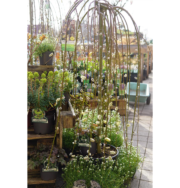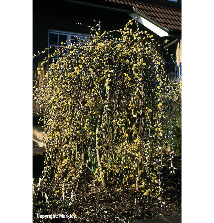 Die Hängende Kätzchenweide 'Pendula' (Salix caprea) ist ein überhängender Kleinbaum, der silbrige, in Kätzchen angeordnete Blüten mit einem leichten Duft hervorbringt. Sie erscheinen von März bis April. An einem sonnigen bis halbschattigen Standort mit durchlässigem, feuchtem bis nassem Boden erreicht sie gewöhnlich eine Höhe von ca. 1,5 m und wird ca. 1 m breit.