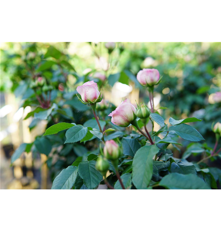 Die sommergrünen Blätter der Beetrose 'Kurfürstin Sophie'® sind dunkelgrün, gefiedert, wechselständig.
