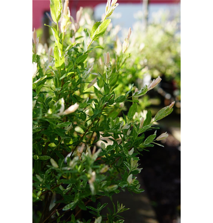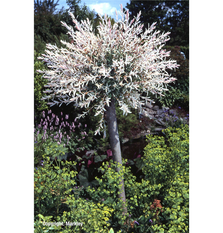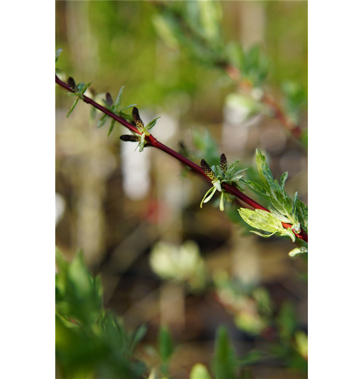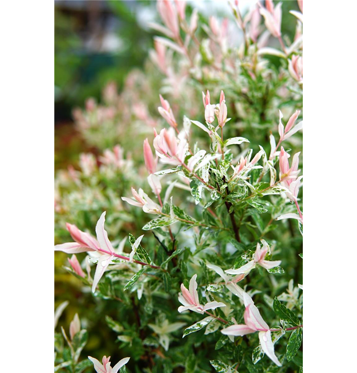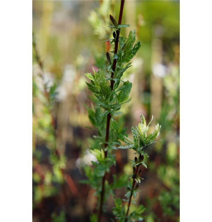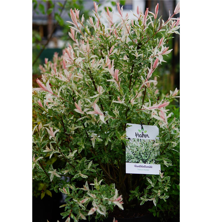 Die Harlekin-Weide 'Hakuro Nishiki' (Salix integra) ist ein buschiger, dichter, Strauch mit dekorativen sommergrünen, lanzettlichen, grün-weißen Blättern. Auch der weiß-rosafarbene Austrieb ist sehr schön.