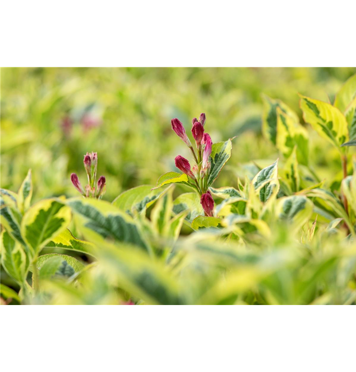 Buntblättrige Weigelie 'Nana Variegata' ist ein buschig, breit und kompakt wachsender Kleinstrauch. Sie erreicht gewöhnlich eine Höhe von 1,5 - 2 m und wird ca. 1 - 2,5 m breit.