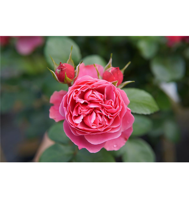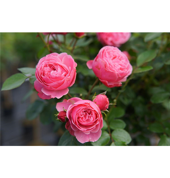 Die dunkelrosafarbenen, starkgefüllten, schalenförmigen Blüten der Beetrose 'Leonardo da Vinci'® erscheinen in Dolden von Juni bis September. Diese werden etwa 6 - 7 cm groß und sind leicht duftend.