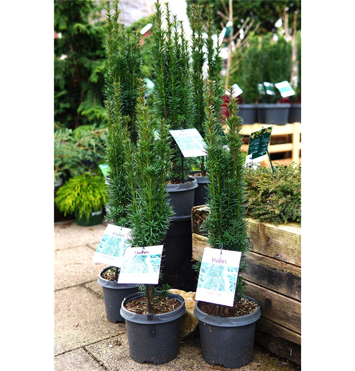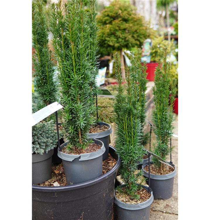 Die Schmale Säuleneibe 'Fastigiata Robusta' (Taxus baccata) ist ein Großstrauch, welcher säulenförmig, straff wächst und gewöhnlich eine Höhe von ca. 8 m und eine Breite von ca. 2,5 m erreicht. Ihre nadelförmigen Blätter haben eine mittelgrüne Färbung. Dekorative rote Zapfen zieren Taxus baccata 'Fastigiata Robusta' ab September. Dieses Gehölz ist gut frostverträglich. Sie bevorzugt durchlässigen, kalkhaltigen, nährstoffreichen Boden in sonniger bis halbschattiger Lage.