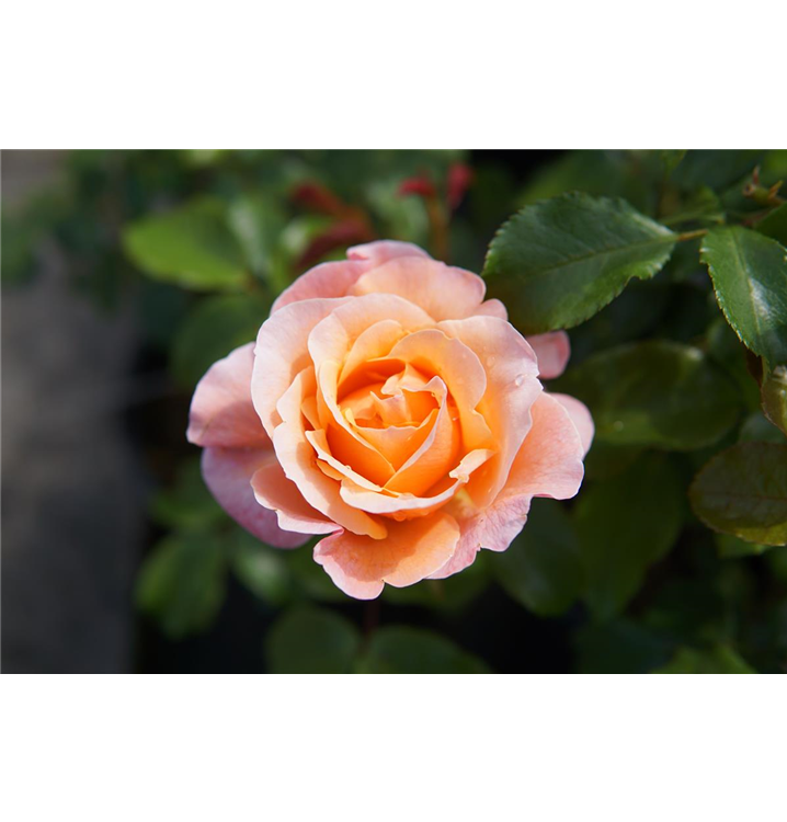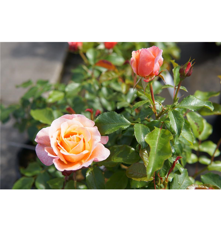 Die apricotfarbenen, gefüllten, schalenförmigen Blüten der Beetrose 'Marie Curie'® erscheinen in Dolden von Juni bis September. Diese werden etwa 6 - 8 cm groß und sind angenehm duftend.