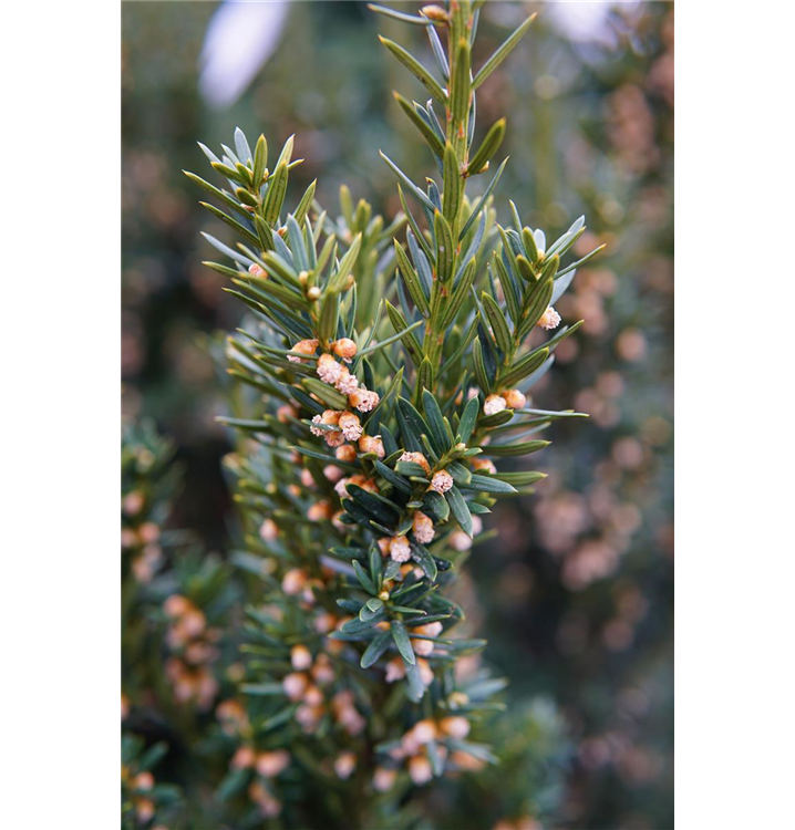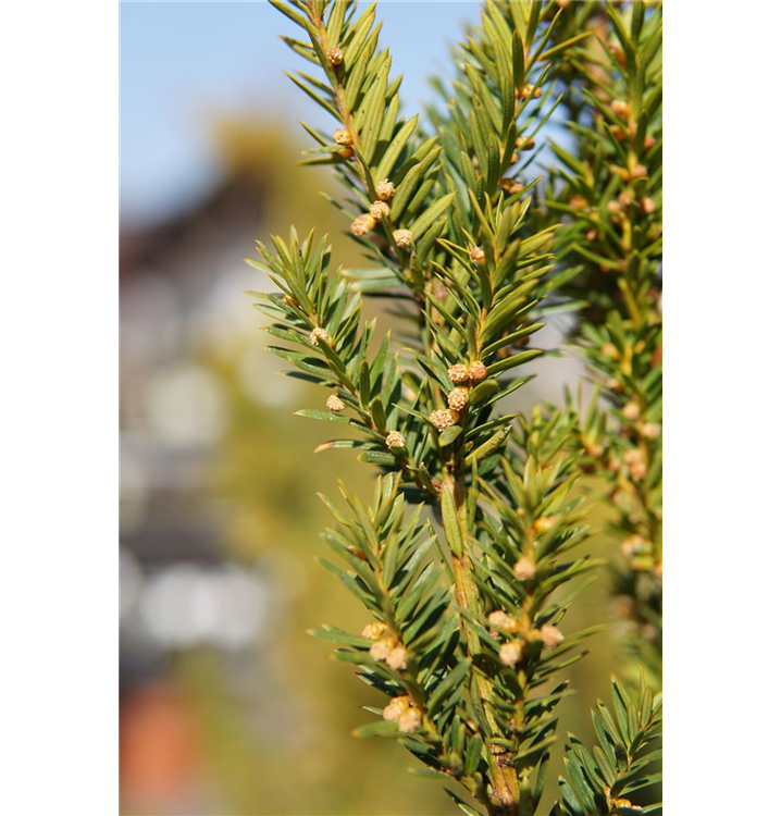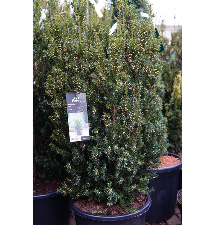 Eibe 'Hillii' ist ein aufrecht, schlank wachsender, malerischer Großstrauch. Ihre dunkelgrünen Blätter sind nadelförmig . An einem sonnigen bis halbschattigen Standort mit durchlässigem, nährstoffreichem Boden erreicht sie gewöhnlich eine Höhe von ca. 5 m und wird ca. 3,5 m breit.
