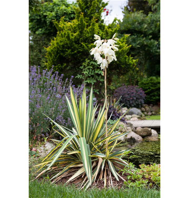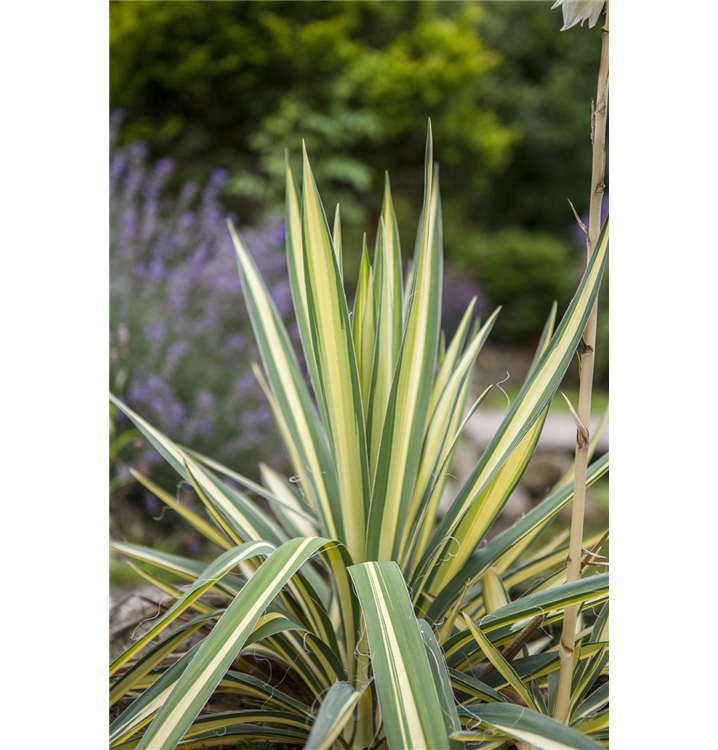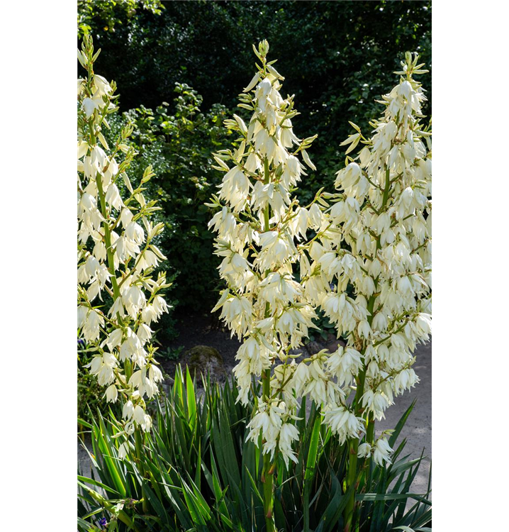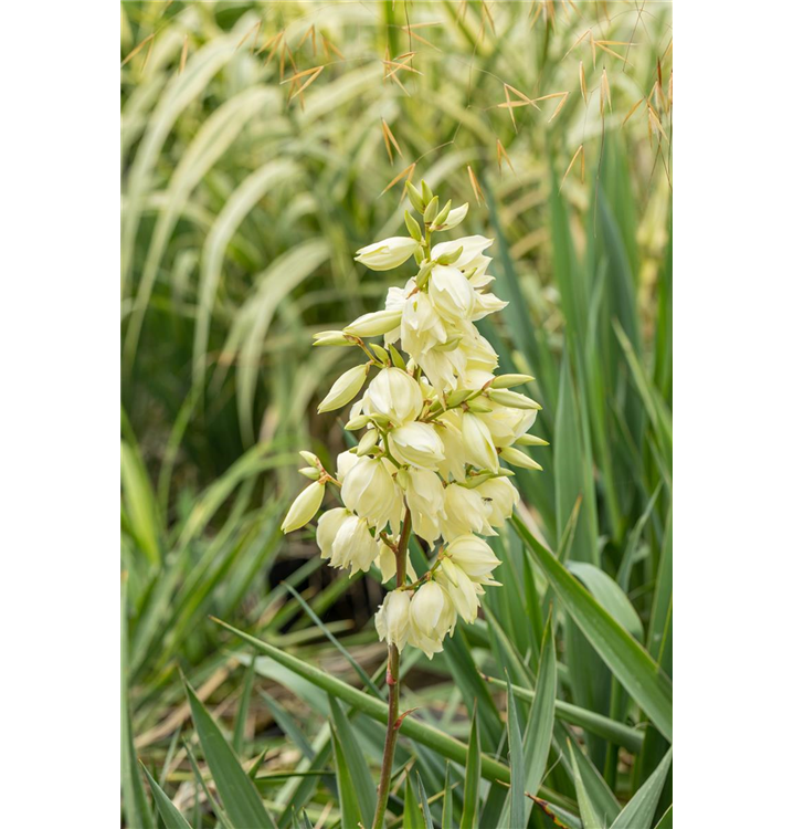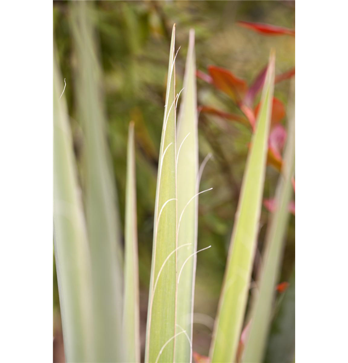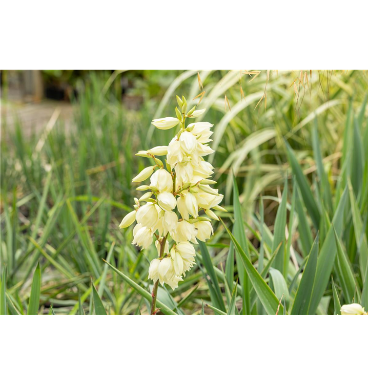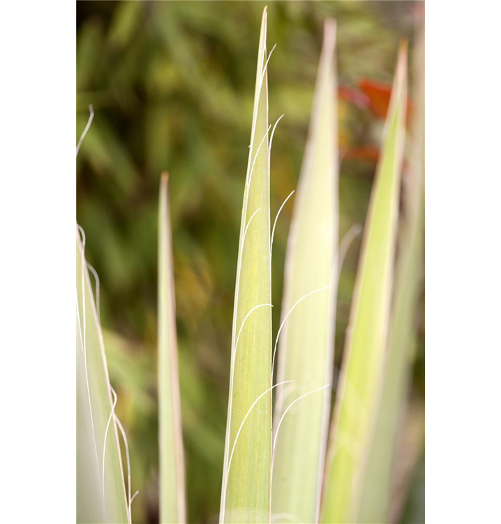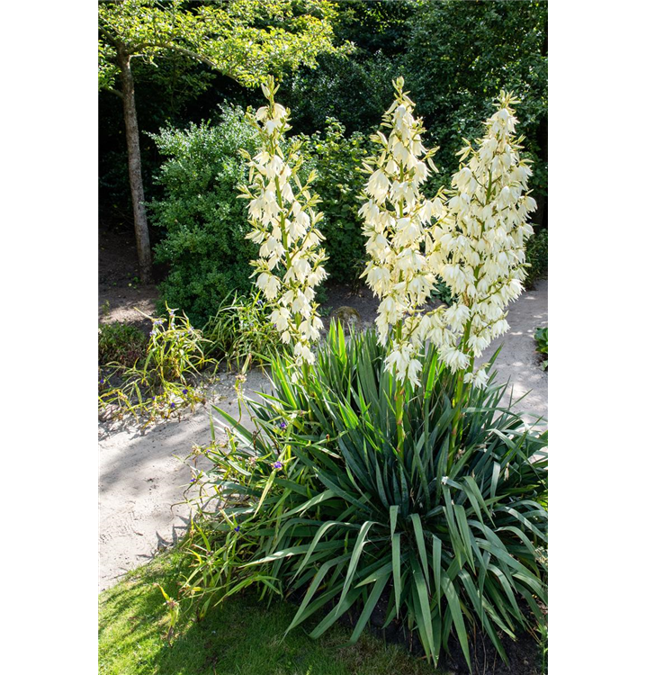 Die Fädige Palmlilie (Yucca filamentosa) ist eine horstbildende wintergrüne Staude mit dekorativen, lanzettlichen, grau-grünen Blättern. An einem sonnigen Standort mit durchlässigem, kalkhaltigem, nährstoffreichem Boden erreicht sie gewöhnlich eine Höhe von ca. 1,4 m und wird ca. 1 m breit. Die Fädige Palmlilie ist gut frostverträglich.