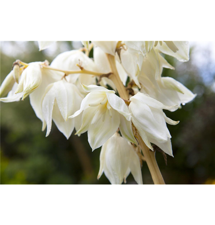 Yucca filamentosa bildet glockenförmige, in Rispen angeordnete, cremeweiße Blüten ab August.