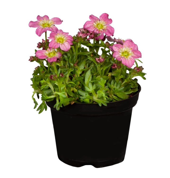 Saxifraga x arendsii, rosa bildet schalenförmige, rosafarbene Blüten ab April.