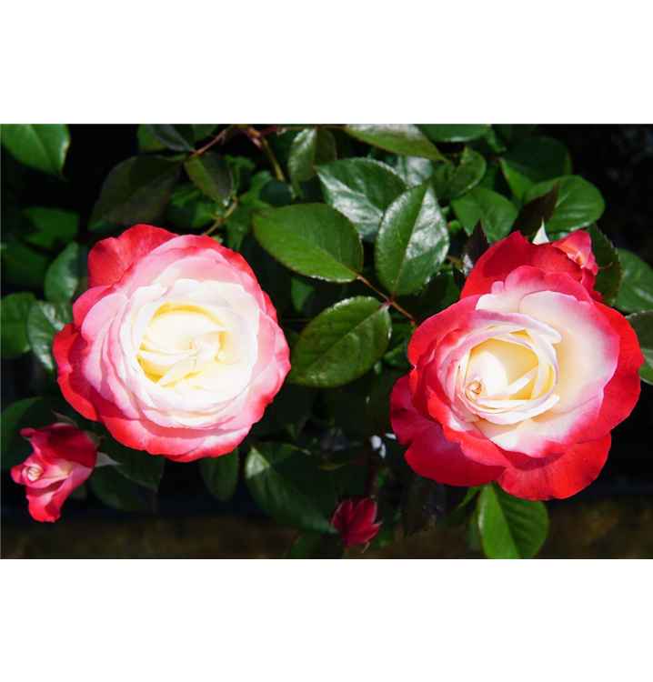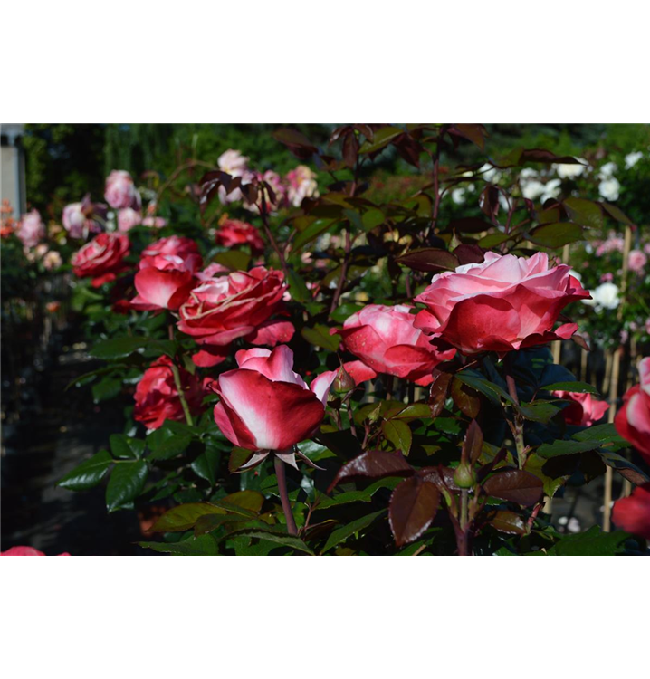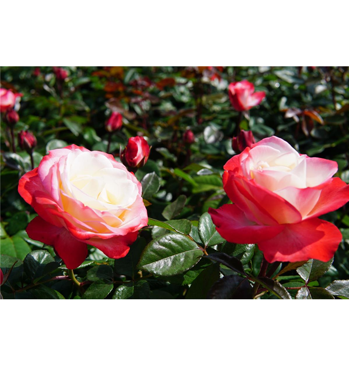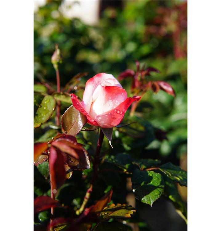 Die Edelrose 'Nostalgie'® (Rosa) ist eine reichblühende Rose, die im Garten eine besondere Rolle spielt. Die zahlreichen starkgefüllten Blüten sind weiß-rot und erscheinen von Juni bis Oktober. Ihr wunderbarer Duft entfaltet sich besonders an sonnigen, warmen Tagen. Mit den richtigen Begleitern an ihrer Seite, kommt die Königin der Blumen besonders gut zur Geltung. Niedrige Stauden, Lavendel und Salbei eignen sich ganz gut für diese Zwecke.