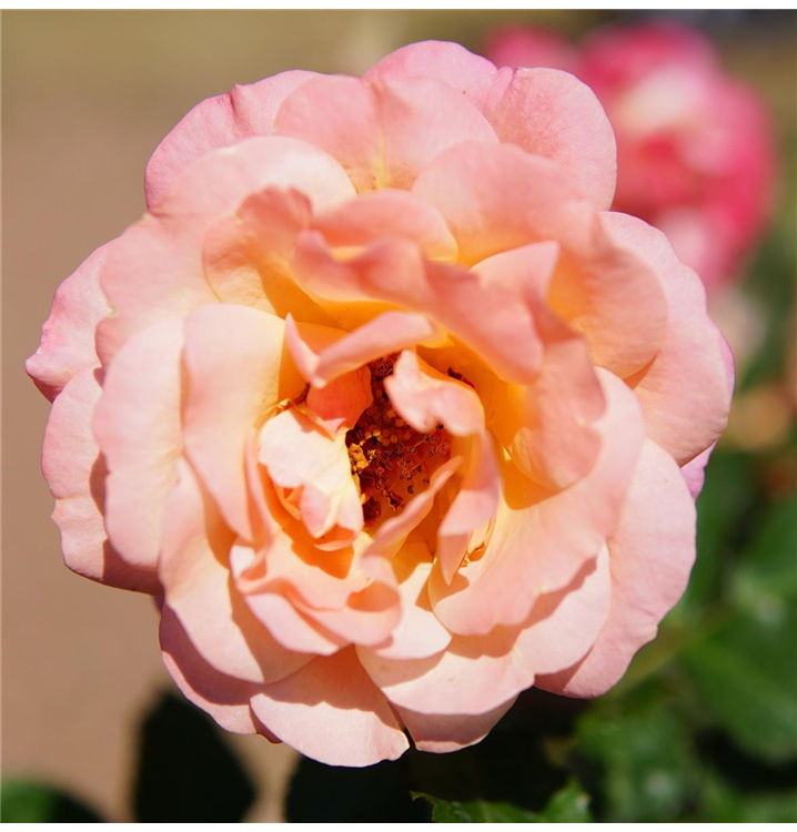 Die apricotfarbenen, schalenförmigen Blüten sind starkgefüllt und erscheinen von Juni bis Oktober. Diese werden etwa 4 - 5 cm groß und sind leicht duftend.