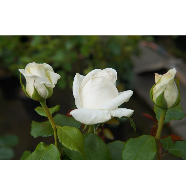 Die Edelrose 'Roger Whittaker' (Rosa) ist eine reichblühende Rose, die im Garten eine besondere Rolle spielt. Die zahlreichen gefüllten Blüten sind weiß und erscheinen von Juni bis Oktober. Ihr wunderbarer Duft entfaltet sich besonders an sonnigen, warmen Tagen. Mit den richtigen Begleitern an ihrer Seite, kommt die Königin der Blumen besonders gut zur Geltung. Niedrige Stauden, Lavendel und Salbei eignen sich ganz gut für diese Zwecke.