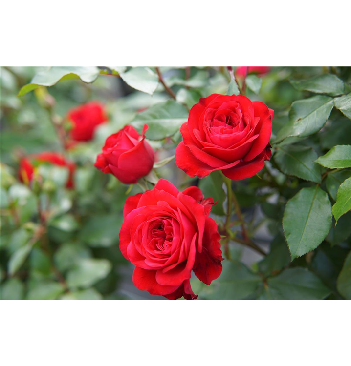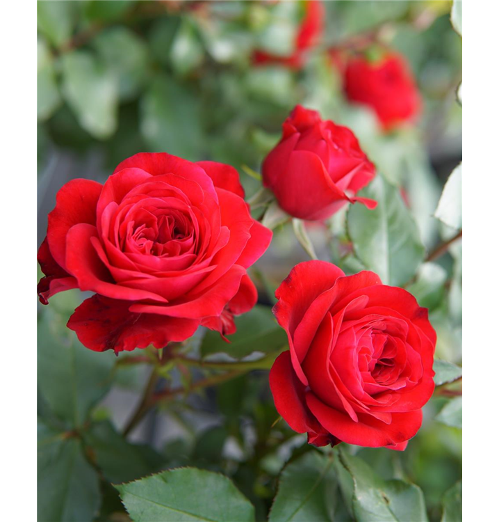 Die Beetrose 'Rouge Meilove'® (Rosa) ist eine reichblühende Rose, die im Garten eine besondere Rolle spielt. Die zahlreichen gefüllten Blüten sind rot und erscheinen von Juni bis September. Ihr wunderbarer Duft entfaltet sich besonders an sonnigen, warmen Tagen. Mit den richtigen Begleitern an ihrer Seite, kommt die Königin der Blumen besonders gut zur Geltung. Niedrige Stauden, Lavendel und Salbei eignen sich ganz gut für diese Zwecke.