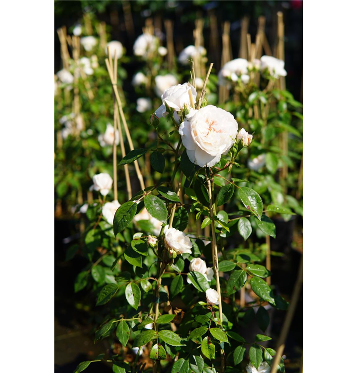 Die Kletterrose 'Sabrina'® (Rosa) ist eine reichblühende Rose, die im Garten eine besondere Rolle spielt. Die zahlreichen halbgefüllten Blüten sind cremeweiß und erscheinen von Juni bis Oktober. Ihr wunderbarer Duft entfaltet sich besonders an sonnigen, warmen Tagen. Mit den richtigen Begleitern an ihrer Seite, kommt die Königin der Blumen besonders gut zur Geltung. Niedrige Stauden, Lavendel und Salbei eignen sich ganz gut für diese Zwecke.