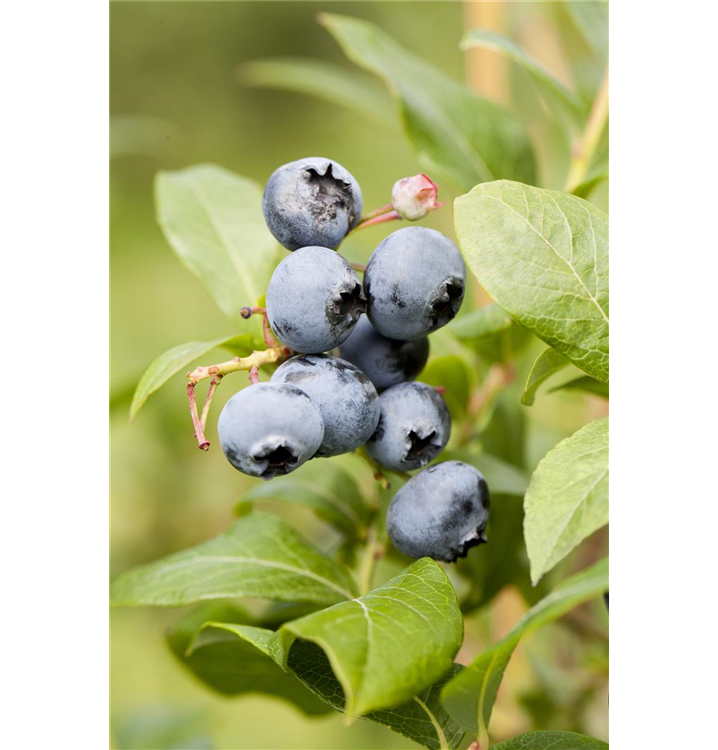 Die Heidelbeere 'Goldtraube' (Vaccinium corymbosum) bildet hellblaue, große Beeren. Diese sind fest und süß-säuerlich im Geschmack. Für eine ertragreiche Ernte ab August schaffen humoser, sandiger, feuchter bis nasser, schwachsaurer Boden und ein sonniger bis halbschattiger Standort optimale Bedingungen. Auch ihre hellrosafarbenen Blüten sind eine schöne Erscheinung.