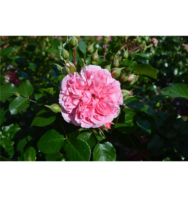 Die sommergrünen Blätter der Beetrose 'Schöne Koblenzerin'® sind dunkelgrün, gefiedert, wechselständig.