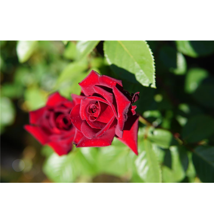 Die sommergrünen Blätter der Edelrose 'Schwarze Madonna'® sind dunkelgrün, gefiedert, wechselständig.