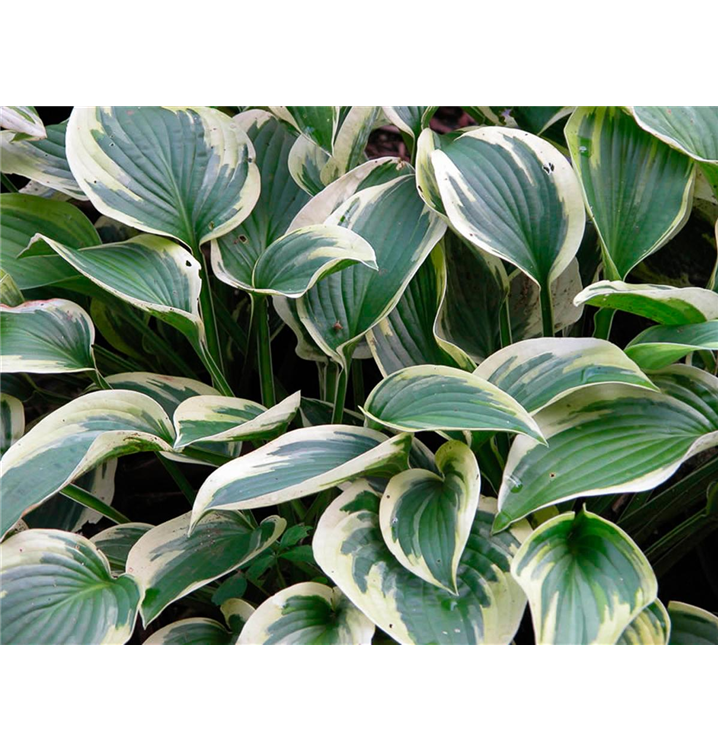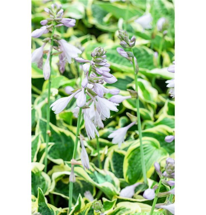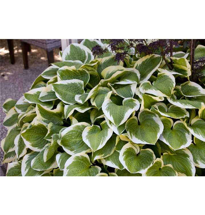 Die Weißrandige Garten-Funkie (Hosta) ist eine horstbildende, buschige, breite Staude mit dekorativen, herzförmigen, ganzrandigen, blau-grünen Blättern mit hellgelbem Blattrand. Von Juni bis Juli trägt sie lilafarbene Blüten. An einem halbschattigen Standort mit durchlässigem, humosem Boden erreicht sie gewöhnlich eine Höhe von ca. 60 cm und wird ca. 50 cm breit. Die Weißrandige Garten-Funkie ist gut frostverträglich.