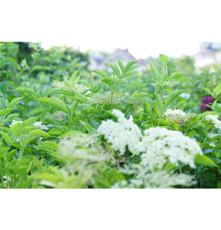 Die cremeweißen Blüten des Schwarzen Holunder erscheinen in Schirmtrauben von Juni bis Juli. Diese sind leicht duftend.