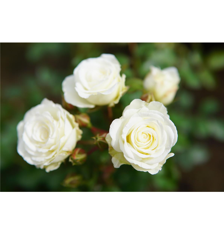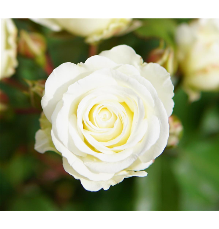 Die Zwergrose 'Schneeküsschen'® (Rosa) ist eine reichblühende Rose, die im Garten aber auch auf Balkon oder Terrasse eine besondere Rolle spielt. Die zahlreichen starkgefüllten Blüten sind weiß und erscheinen von Juni bis Oktober.