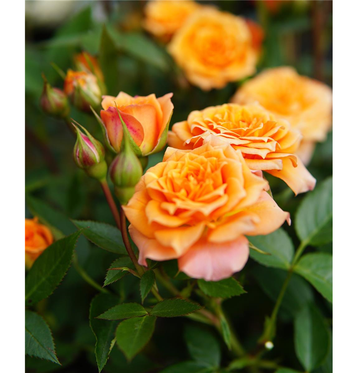 Die Zwergrose 'Clementine'® (Rosa) ist eine reichblühende Rose, die im Garten sowie auf Balkon oder Terrasse eine besondere Rolle spielt. Ihre zahlreichen gefüllten Blüten erstrahlen in einem zarten Apricot und erscheinen von Juni bis Oktober. Diese kompakte Rose verleiht jedem Bereich, sei es im Freien oder auf begrenztem Raum, eine anmutige Eleganz und einen Hauch von Farbe, der lange Freude bereitet und einen bezaubernden Duft verbreitet.