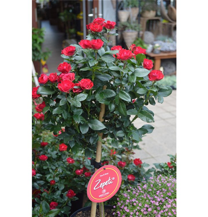 Die Rose 'Zepeti'® (Rosa) ist eine reichblühende Rose, die im Garten eine besondere Rolle spielt. Die gefüllten Blüten sind rot und erscheinen zahlreich von Juni bis Oktober. Mit den richtigen Begleitern an ihrer Seite, kommt die Königin der Blumen besonders gut zur Geltung. Niedrige Stauden, Lavendel und Salbei eignen sich ganz gut für diese Zwecke.