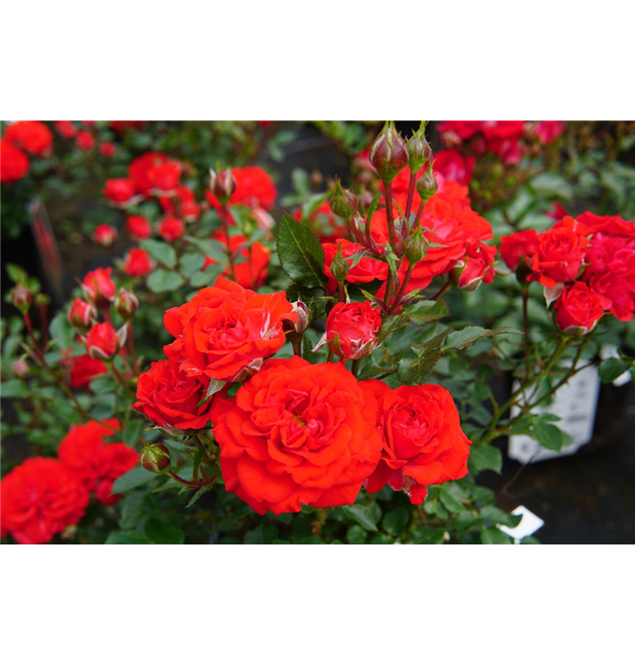 Die Zwergrose 'Zwergenfee 09'® (Rosa) ist eine reichblühende Rose, die im Garten aber auch auf Balkon oder Terrasse eine besondere Rolle spielt. Die zahlreichen gefüllten Blüten sind orange-rot und erscheinen von Juni bis Oktober. Mit dem kompakten Wuchs wird dieses Gehölz bis zu 40 cm hoch und 40 cm breit.