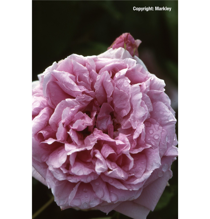 Die rosafarbenen, schalenförmigen Blüten sind gefüllt und erscheinen von Juni bis Juli. Diese werden etwa 5 - 10 cm groß und sind stark duftend.