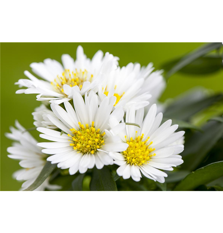 Aster dumosus, weiß bildet körbchenartige, weiße Blüten ab September. Diese verströmen einen angenehmen Duft.