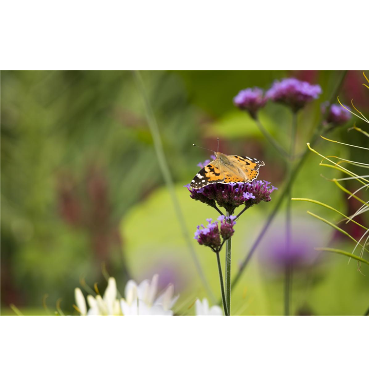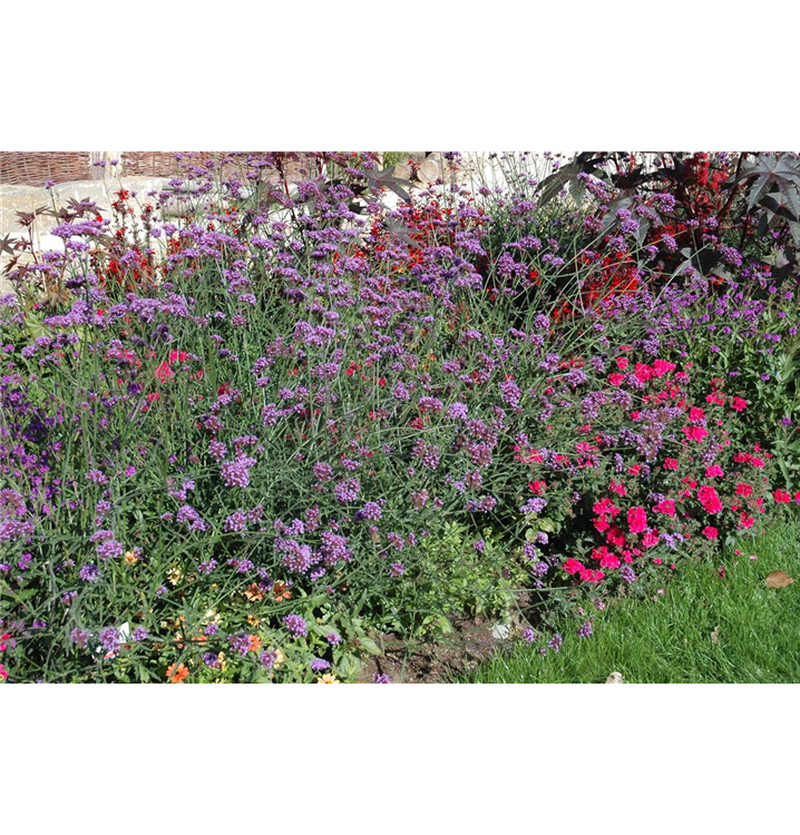 Verbena bonariensis bildet in Dolden angeordnete, magentafarbene Blüten ab Juli.