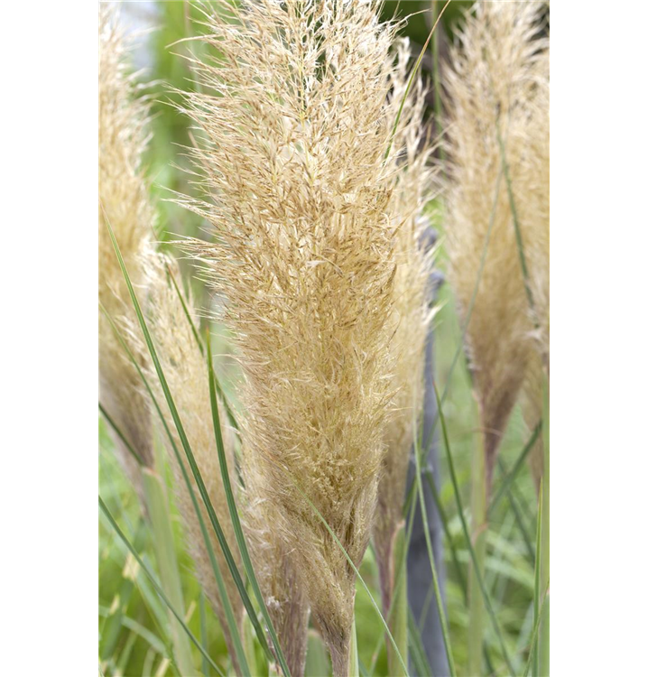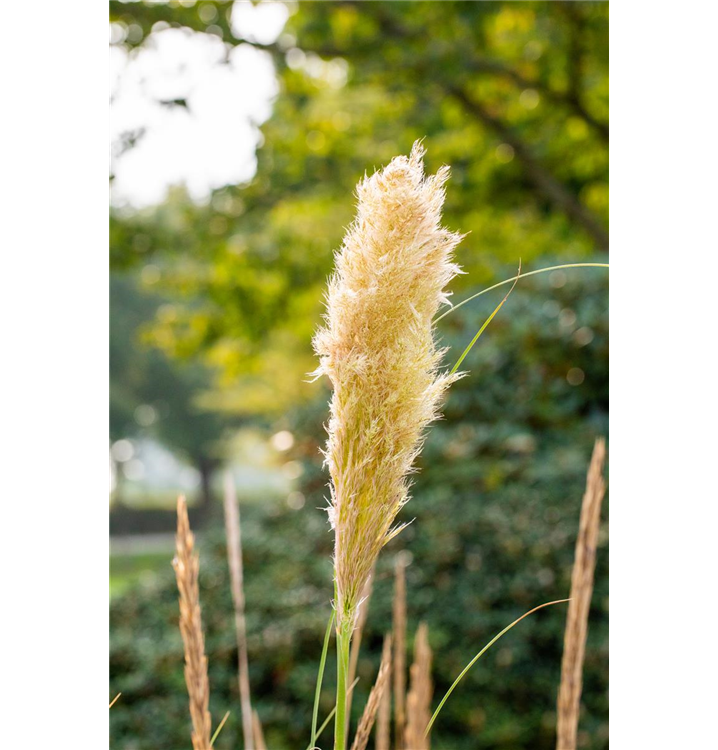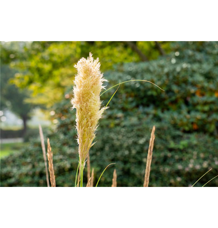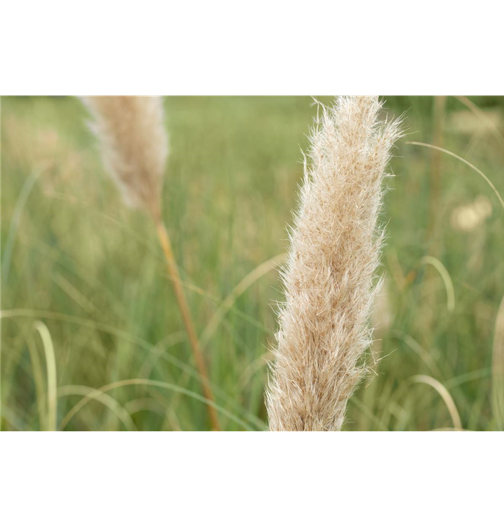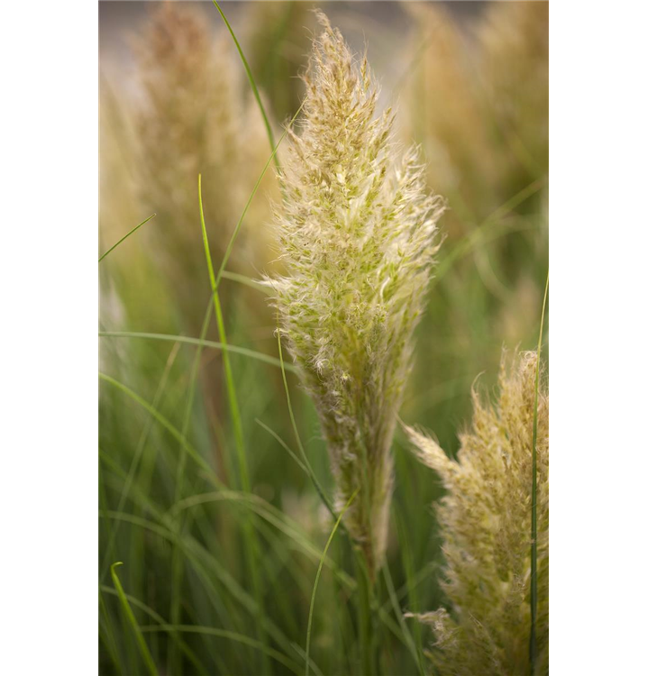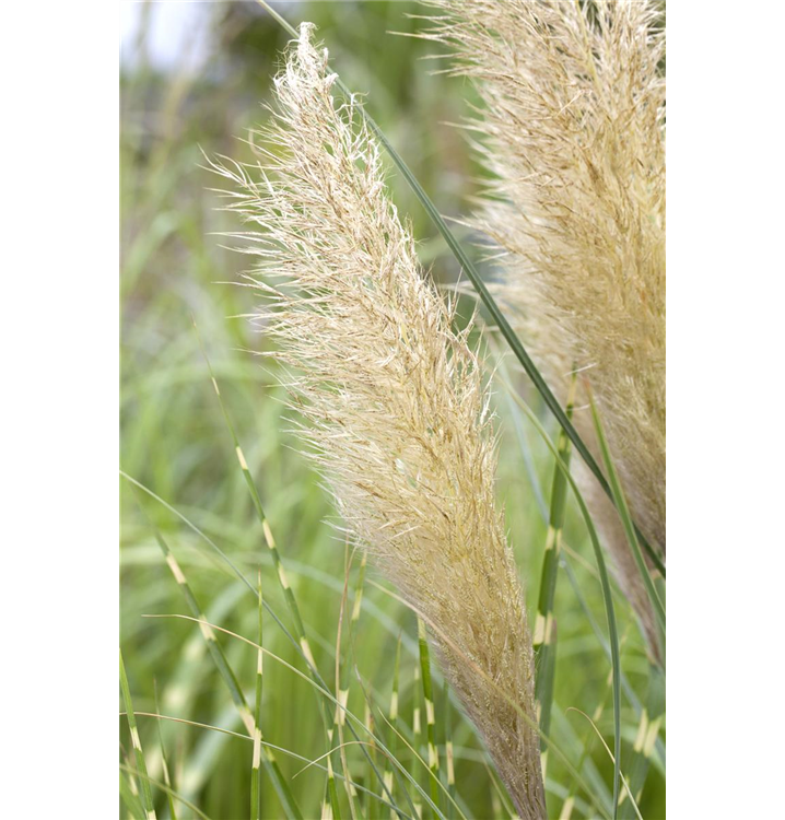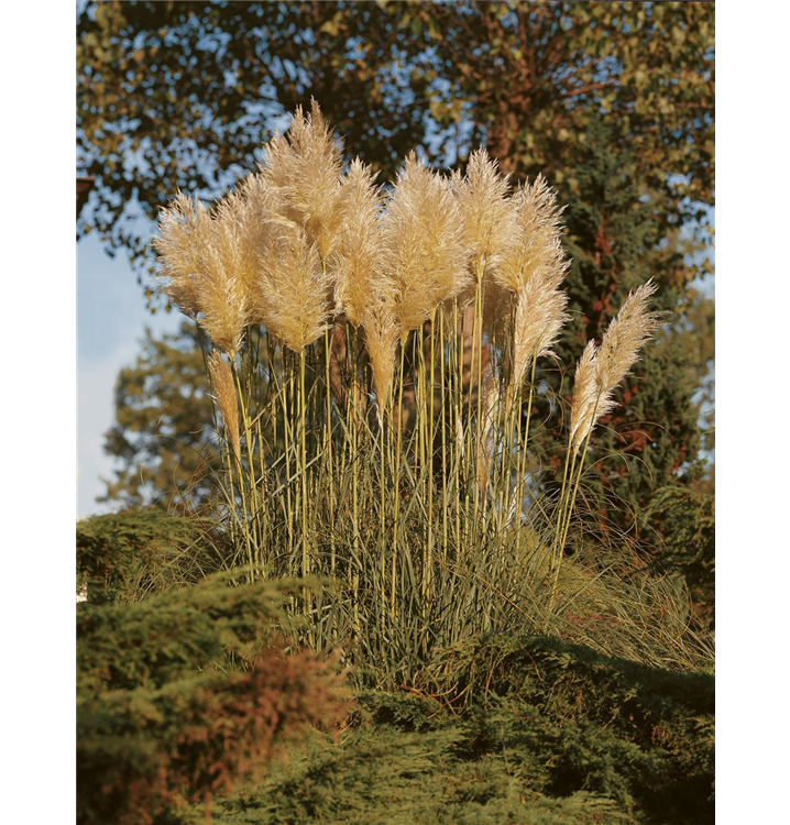 Das Kleine Garten-Pampasgras 'Pumila' (Cortaderia selloana) ist mit seiner dunkelgrünen Blattfärbung ein dekoratives Gestaltungselement im Garten, welches sich an einem sonnigen Standort mit einem möglichst durchlässigen, humosen, nährstoffreichen Boden am wohlsten fühlt. Die silberweißen Blütenwedel schmücken die horstbildend und kompakt wachsende Pflanze ab Herbst. Bei günstigen Bedingungen erreicht dieses winterharte Gras eine Höhe von ca. 1,2 m und wird bis zu 1,2 m breit.