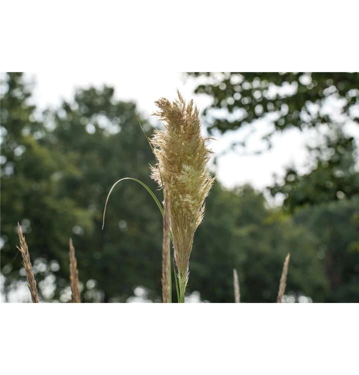Die silberweißen Blüten des Kleinen Garten-Pampasgras 'Pumila' erscheinen in Rispen von September bis Oktober.