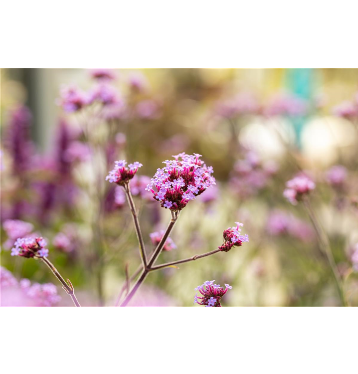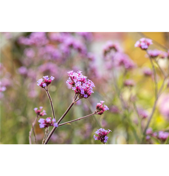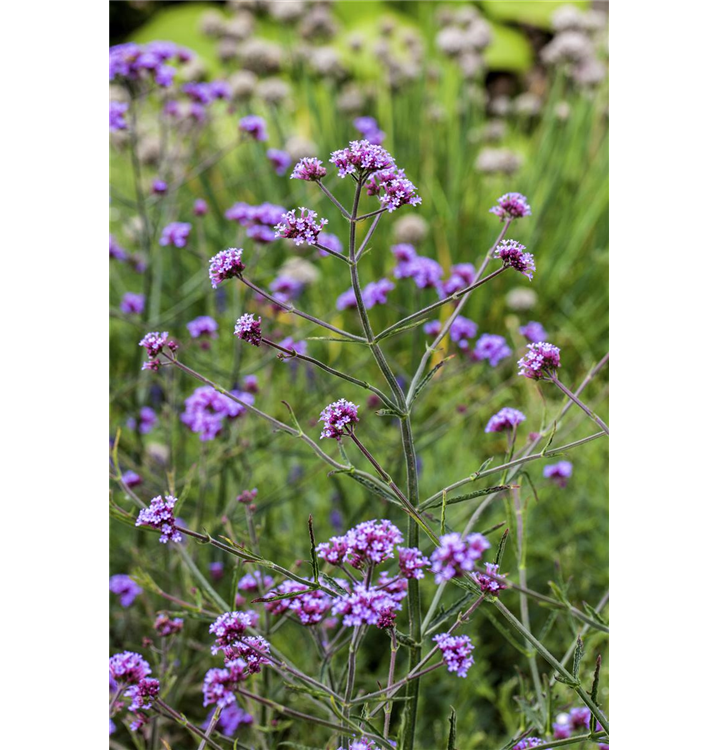 Das Eisenkraut 'Lollipop' (Verbena bonariensis) ist eine aufrechte, horstbildende wintergrüne Staude, die von Juli bis Oktober lilafarbene Blüten bildet. An einem sonnigen Standort mit durchlässigem, nährstoffreichem Boden erreicht es gewöhnlich eine Höhe von ca. 1,2 m und wird ca. 50 cm breit.