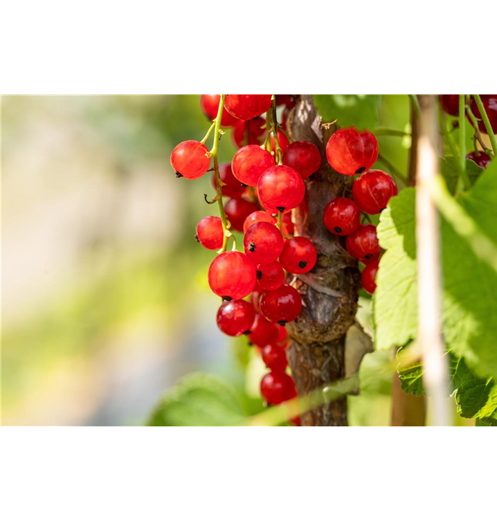 Die Johannisbeere 'Jonkheer van Tets' (Ribes rubrum) bildet dunkelrote, sehr große Beeren. Säuerlich, aromatisch im Geschmack, besitzt die Johannisbeere 'Jonkheer van Tets' eine dünne Schale. Für eine ertragreiche Ernte ab Juni schaffen durchlässiger, nährstoffreicher Boden und ein sonniger bis halbschattiger Standort optimale Bedingungen. Auch ihre grünen Blüten sind eine schöne Erscheinung.