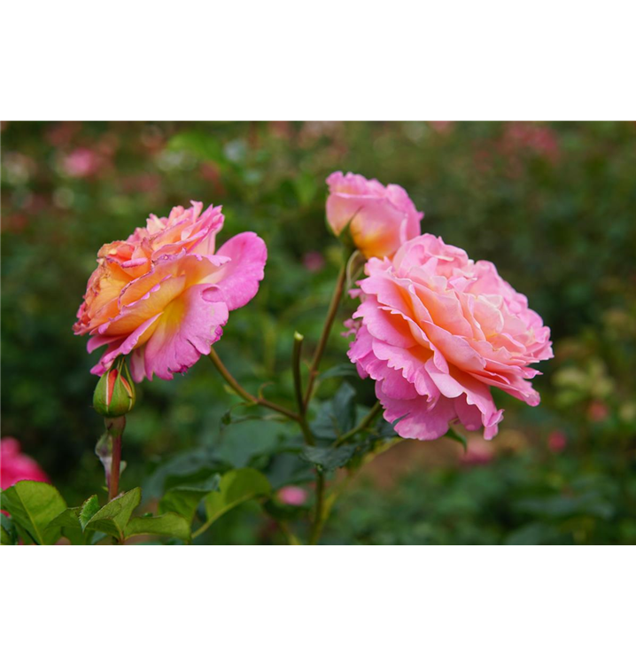 Die Edelrose 'Dornburger Schlossrose'® (Rosa) ist eine reichblühende Rose, die im Garten eine besondere Rolle spielt. Die zahlreichen gefüllten Blüten sind rosa-gelb und erscheinen von Juni bis Oktober. Ihr wunderbarer Duft entfaltet sich besonders an sonnigen, warmen Tagen. Mit dem buschigen und aufrechten Wuchs wird dieser Kleinstrauch bis zu 1,2 m hoch und 50 cm breit.